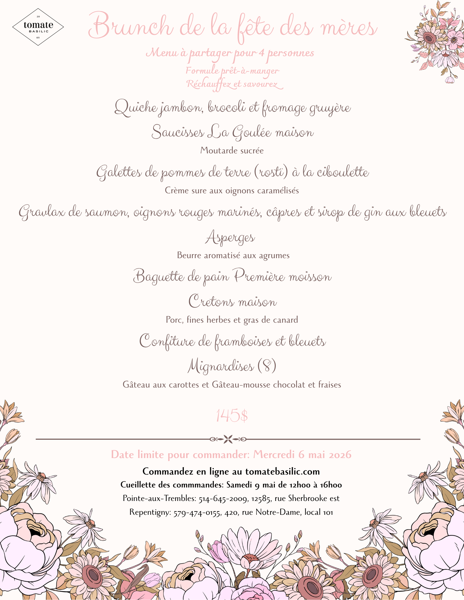 Nous prenons les commandes jusqu'à 21h mercredi le 1er avril.